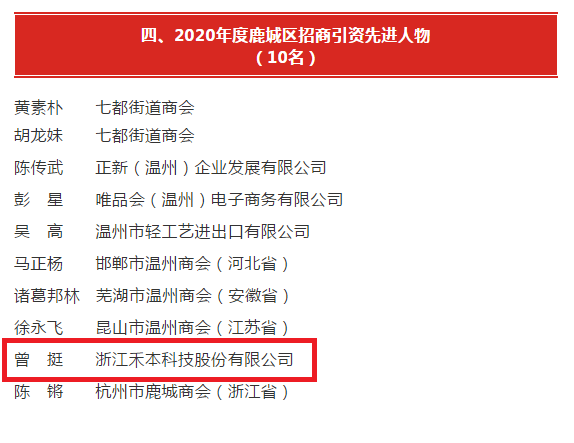 公司董事长曾挺荣获“2020年度功勋企业家”“2020年度鹿城区招商引资先进人物”。