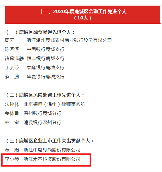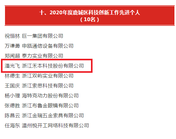 公司李小琴、潘光飞分别荣获“鹿城区企业上市工作突出贡献个人”和“2020年度鹿城区科技创新工作先进个人”。